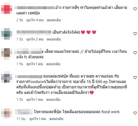 อ่านข่าวต้นฉบับได้ที่ : รายการอาหารดัง ประกาศเทปสุดท้าย แฟนๆแห่เสียดาย เป็นกำลังใจ เชฟบุ๊ค