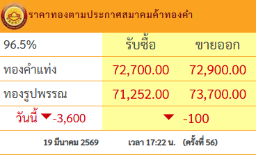 ราคาทองวันนี้ (19 มี.ค. 69) ผันผวนปรับ 56 ครั้ง ร่วงแรง 3,600 บาท ทองรูปพรรณบาทละ 73,700 บาท ทองคำแท่ง 96.5% ขายออกบาทละ 72,900 บาท