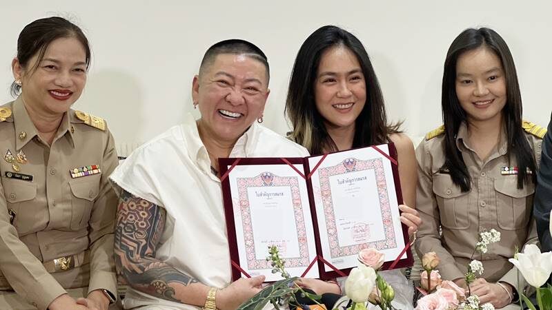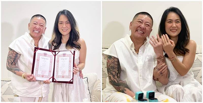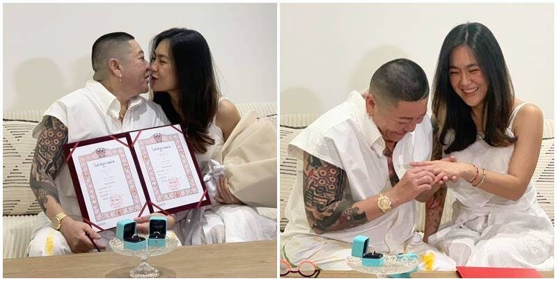 หลังจากจดทะเบียนสมรสเสร็จสิ้นแล้ว ทั้งคู่ได้สวมแหวนให้กัน พร้อมเปิดใจกับสื่อมวลชนทั้งน้ำตาด้วยความรู้สึกตื้นตันใจ รอคอยวันนี้มา 16 ปี ได้เป็นสามีภรรยากันอย่างถูกต้องตามกฎหมาย