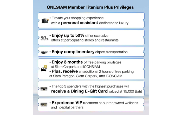 ทั้งนี้ เพื่อต่อยอดความสำเร็จที่เกิดขึ้นจึงเดินหน้ายกระดับประสบการณ์และขยายฐานสมาชิกใหม่ ตลอดจนกระตุ้นการใช้จ่ายของสมาชิก ONESIAMMember ในปี 2568 ยังได้จัดเตรียมสิทธิพิเศษมากมายเพื่อมุ่งให้กลุ่มลูกค้าและสมาชิก ONESIAM ได้รับประสบการณ์ที่ดีที่สุดในการช็อปปิงจากทั้ง 6 ศูนย์การค้าในเครือสยามพิวรรธน์ โดยเฉพาะสมาชิก ONESIAM Titanium ที่มียอดใช้จ่ายสะสม 500,000บาท ขึ้นไป อีกด้วย