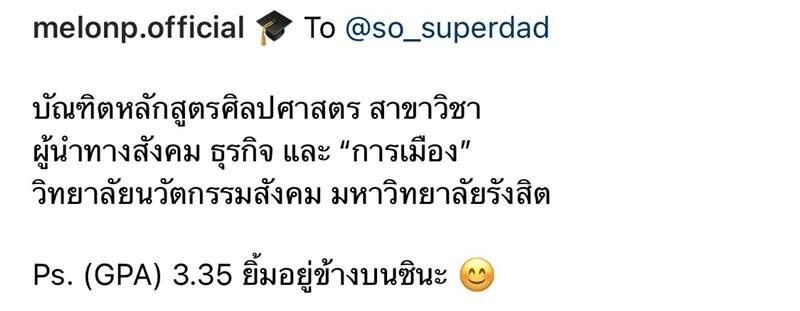 ทำไมถึงเลือกเรียนในสาขาวิชาทางสังคมผู้นำทางสังคม ธุรกิจ และการเมือง? “โดยสภาวะโมแล้วเนเจอร์โมมีความเป็นผู้นำสูง แล้วก็เราอยากจะรู้ในสิ่งที่เราไม่เคยรู้ คุณพ่อเป็นศิษย์ธรรมศาสตร์อยู่แล้ว เลือดการเมืองของคุณพ่อมันเยอะมาก”