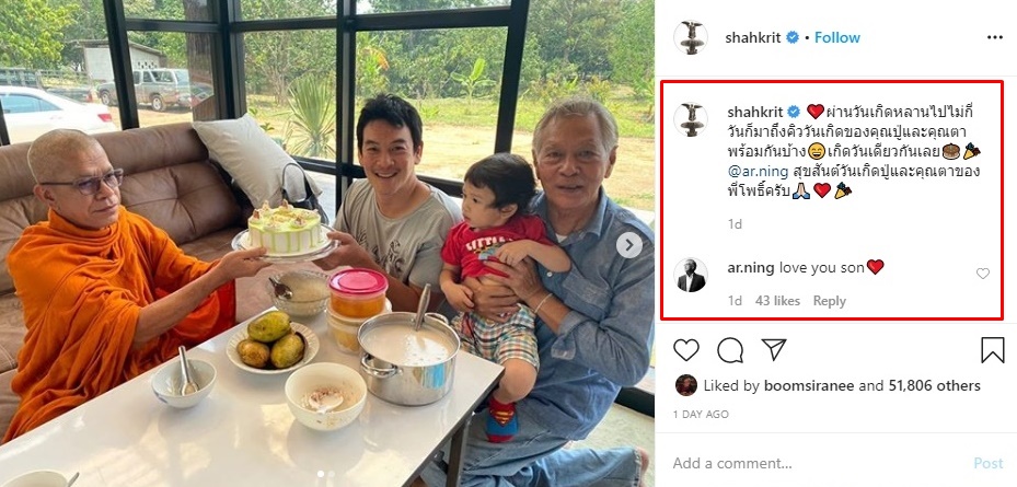 ล่าสุด หนุ่มชาคริต โพสต์ภาพ พร้อมหน้า 3 เจเนอเรชั่น ทำบุญวันเกิดส่วนตัวที่บ้านสวน ปู่หนิง พร้อมแคปชั่นว่า