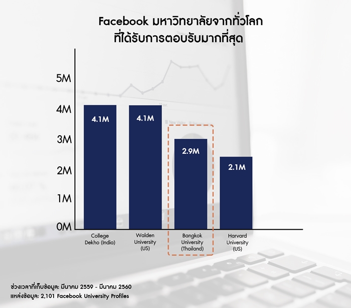 ดังเช่นแฟนเพจเฟซบุ๊กของมหาวิทยาลัยกรุงเทพที่กำลังจะมียอดผู้ติดตามแตะครึ่งล้านในไม่ช้า และล่าสุดยังสร้างปรากฏการณ์ให้กับแวดวงสถาบันการศึกษาไทย ด้วยการขึ้นแท่นอันดับ 3 เพจที่มียอด engagement สูงสุดของโลกในหมวดหมู่สถาบันการศึกษา เอาชนะมหาวิทยาลัยฮาวาร์ดในสหรัฐอเมริกาที่ครองอันดับ 4 ไปอย่างสง่าผ่าเผย จากการสำรวจของ Socialbakers เว็บไซต์ด้านการวิเคราะห์และจัดอันดับสื่อโซเชียลที่ได้รับความเชื่อถือในระดับสากล น่าสนใจว่ามหาวิทยาลัยกรุงเทพทำได้อย่างไร?