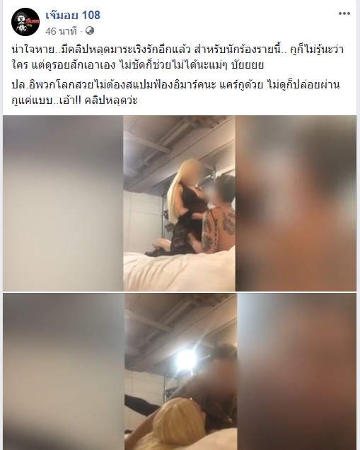 ซึ่งเพจ เจ๊มอย 108 ยังเผยด้วยว่า “น่าใจหาย..มีคลิปหลุดมาระเริงรักอีกแล้ว สำหรับนักร้องรายนี้.. ก็ไม่รู้นะว่าใคร แต่ดูรอยสักเอาเอง ไม่ชัดก็ช่วยไม่ได้นะแม่ๆ บัยยยย”