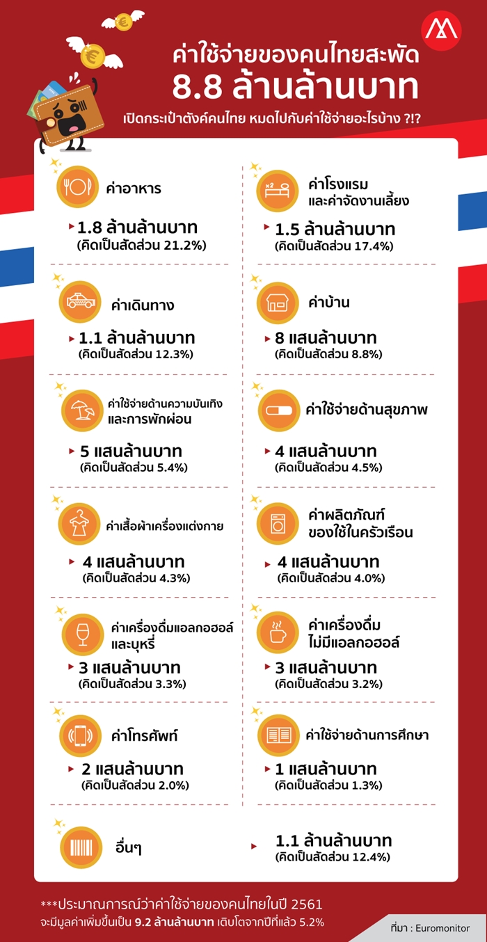 “Euromonitor” เปิดผลวิจัยค่าใช้จ่ายของผู้บริโภคในประเทศไทย ปี 2560 มีมูลค่า 8.8 ล้านล้านบาท ครอบคลุมสิ่งที่อยู่ในชีวิตประจำวัน เช่น ค่าอาหาร, ค่าเดินทาง, ค่าบ้าน, ค่าใช้จ่ายด้านความบันเทิงและการพักผ่อน, ค่าเครื่องดื่มทั้งแอลกอฮอล์ และไม่มีแอลกอฮอล์ ฯลฯ พร้อมทั้งประมาณการณ์ว่าในปี 2561 ค่าใช้จ่ายของคนไทย จะมีมูลค่าเพิ่มขึ้นเป็น 9.2 ล้านล้านบาท เติบโตจากปีที่แล้ว 5.2%