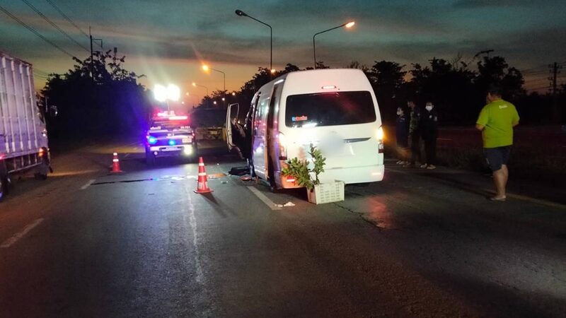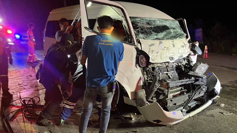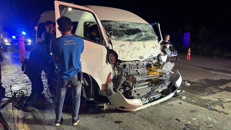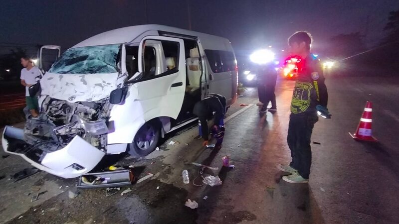 12ชีวิตระทึก โชเฟอร์หลับใน ขับรถตู้โดยสาร พุ่งเสยท้ายรถบรรทุกอาหารสัตว์