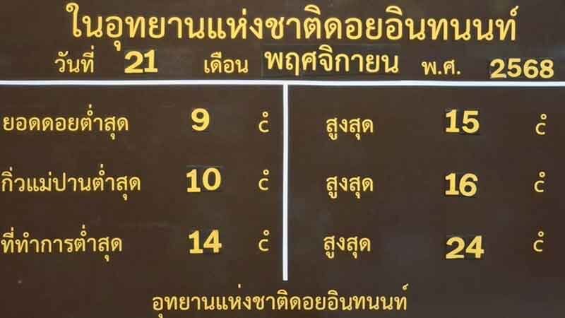 วันที่ 21 พ.ย.2568 นายจีรนิติ เชิงสะอาด หัวหน้าอุทยานแห่งชาติดอยอินทนนท์ จ.เชียงใหม่ เปิดเผยว่า บรรยากาศเช้าวันนี้ เวลา 06.00 น. ยอดดอยและกิ่วแม่ปานอากาศเปิด คุณภาพอากาศดีมาก อุณหภูมิต่ำสุด ยอดดอย 9 องศาเซลเซียส กิ่วแม่ปาน 10 องศาเซลเซียส บริเวณที่ทำการ 14 องศาเซลเซียส นักท่องเที่ยวเริ่มคึกคัก เดินทางมาสัมผัสอากาศหนาว และทะเลหมอกขาวโพลน สวยงามอย่างมาก