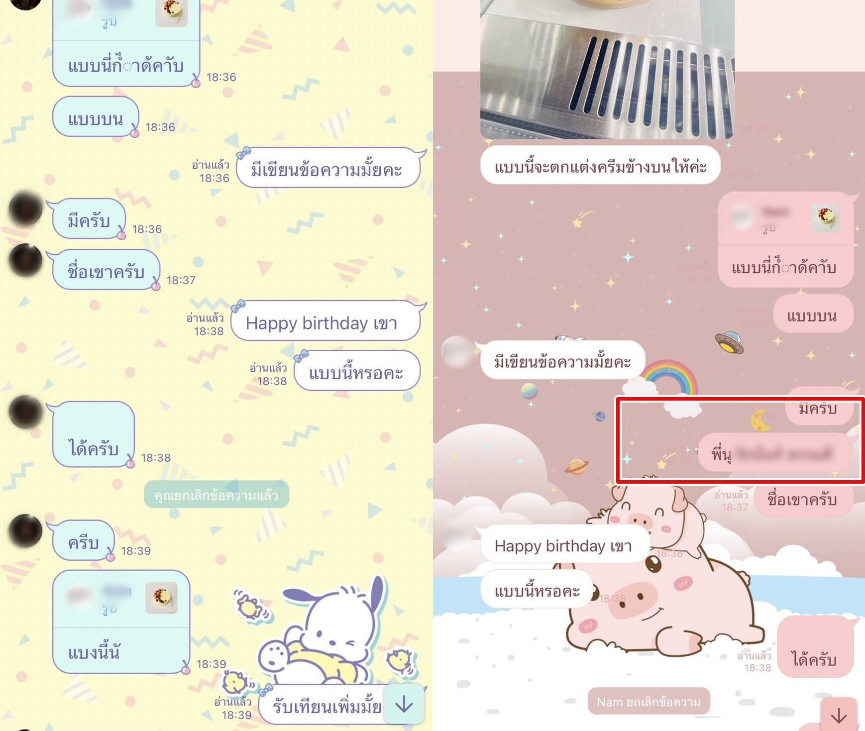 แต่ทางร้านกลับเขียนแค่คำว่า "เขา" แทนชื่อพี่ชายของตน จากนั้นทางร้านจึงเปิดไลน์ของฝั่งร้านให้ดูว่า ข้อความที่ตนพิมพ์ชื่อเต็มของพี่ชายมานั้น มันไม่ขึ้นพอดี ส่วนข้อความอื่นกลับขึ้นหมด จากนั้นทางร้านก็นำเค้กกลับไปแก้ชื่อให้ ตนรอประมาณ 5 นาที ก็ได้เค้กอันเดิมที่ถูกแก้ไขเปลี่ยนชื่อเรียบร้อย