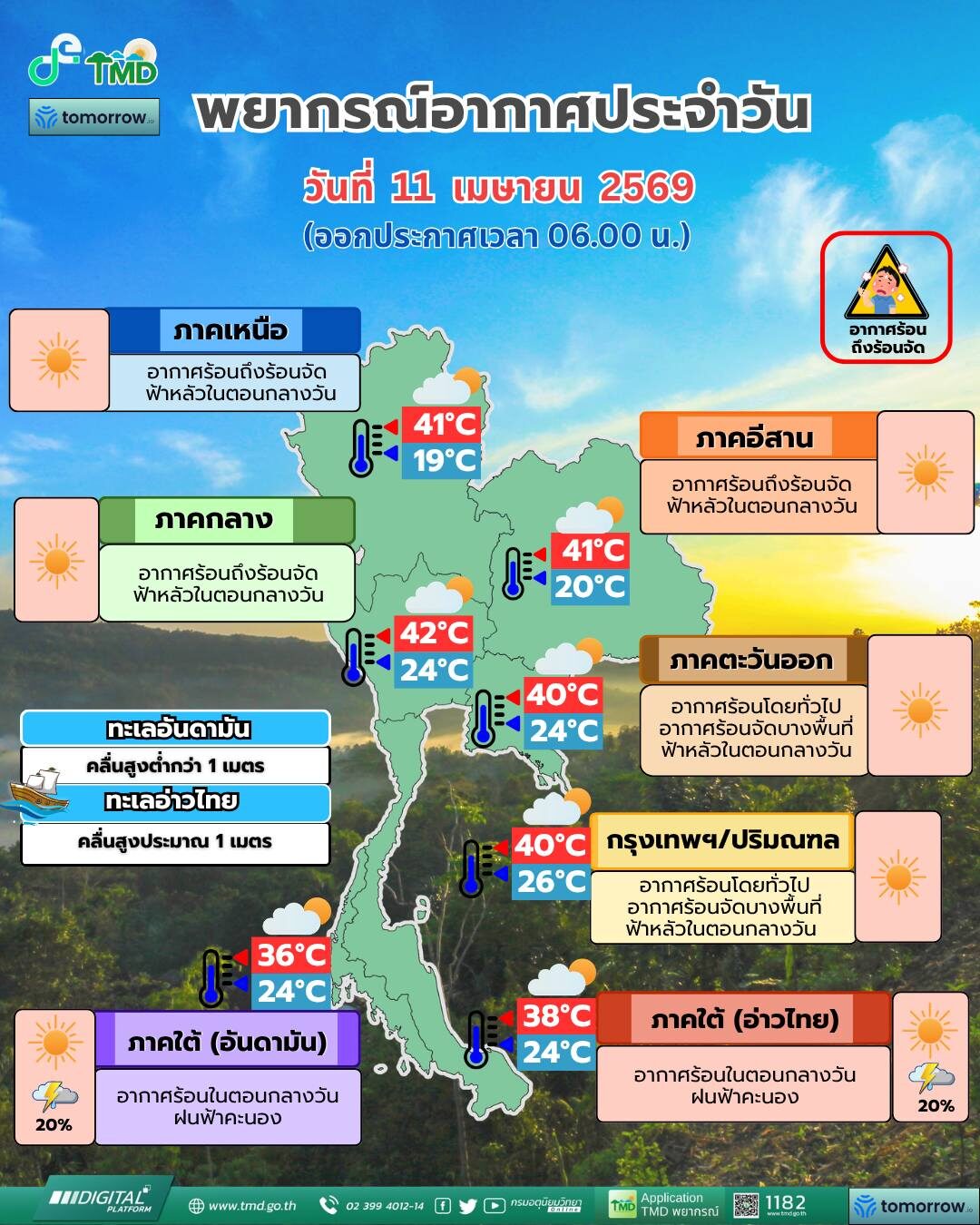 วันที่ 11 เม.ย.2569 กรมอุตุนิยมวิทยา พยากรณ์อากาศ 24 ชั่วโมงข้างหน้า ประเทศไทยตอนบนมีอากาศร้อนโดยทั่วไปและมีอากาศร้อนจัดบางพื้นที่ กับมีฟ้าหลัวในตอนกลางวัน เนื่องจากความกดอากาศต่ำ เนื่องจากความร้อนปกคลุมประเทศไทยตอนบน