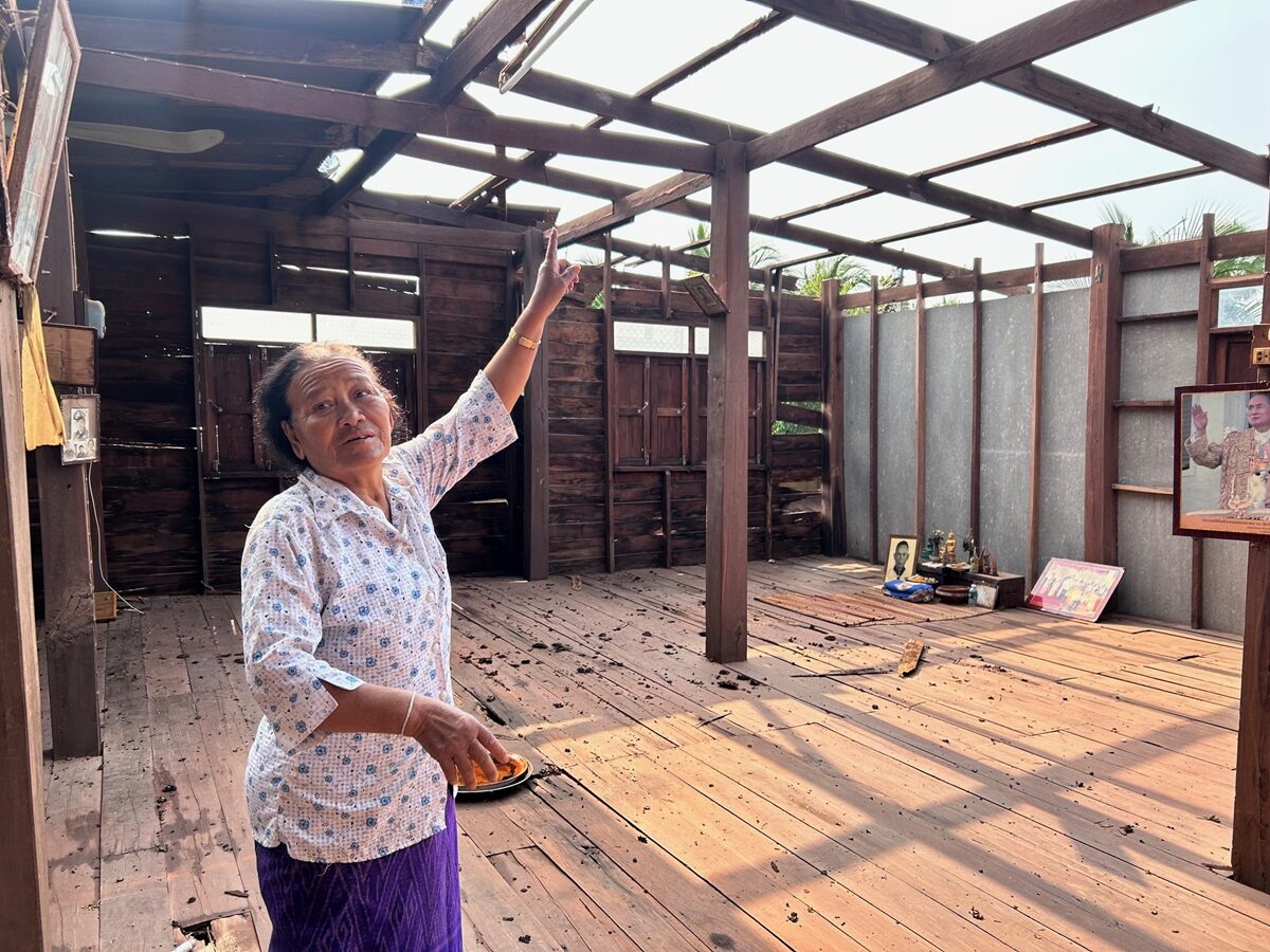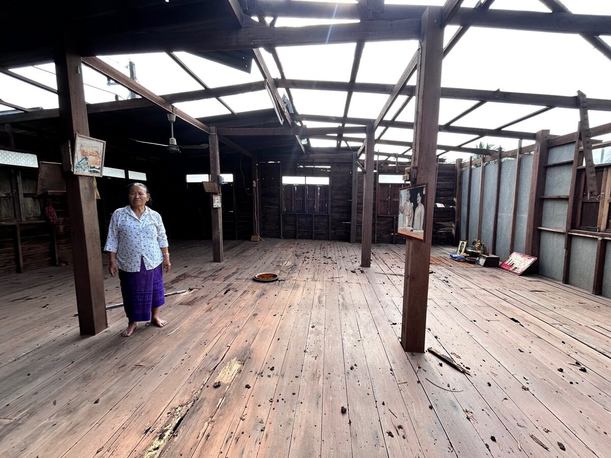 นางจันทร์เพ็ง ชัยพัฒน์ อายุ 77 ปี ชาวบ้านหมู่ 7 ซึ่งเป็นบ้านสองชั้นครึ่งปูนครึ่งไม้ หลังคาสังกะสีถูกแรงลมพัดปลิวหายไปทั้งหมด เล่าว่า ช่วงเย็นวานนี้ มีน้ำหยดลงจากข้างบน ลมกระโชกแรง ฝนตกอยู่นาน พอพายุฝนสงบแล้วก็ขึ้นมาสำรวจความเสียหายจึงพบว่าหลังคาบ้านทั้งหลังหลุดหายไปทั้งแถบ