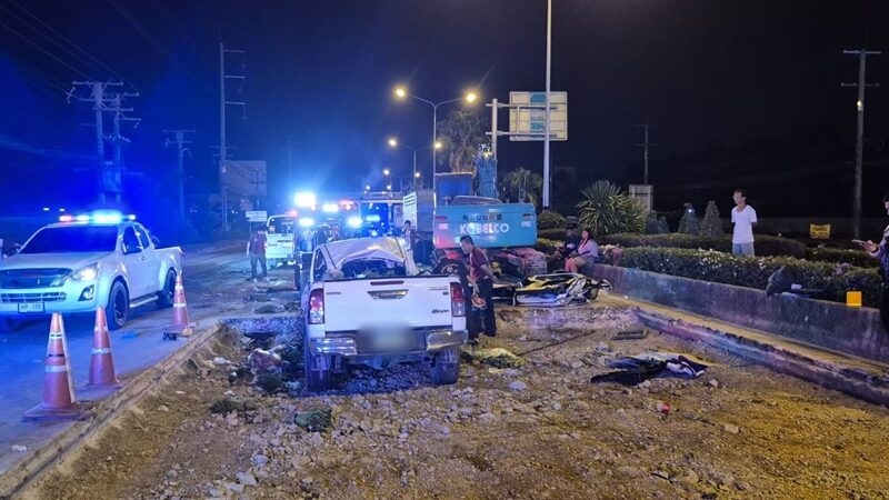 สลด 3 ศพ พ่อแม่ลูก ขับกระบะไปขายผักที่ตลาด พุ่งตกหลุมถนนที่กำลังซ่อมสร้าง รถกระแทกขอบปูนพังเสียหายยับเยิน เสียชีวิตยกครอบครัว