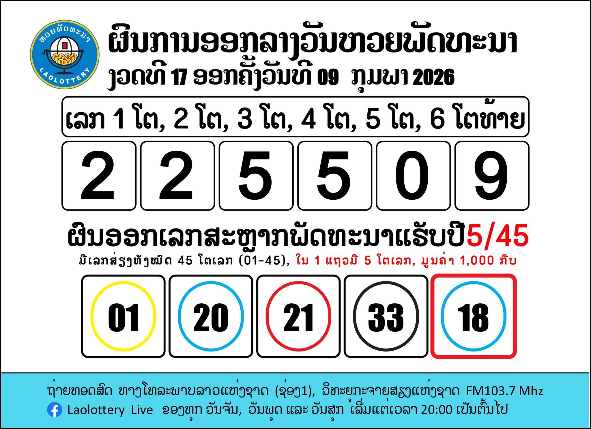 หวยลาววันนี้ งวดประจำวันที่ 9 กุมภาพันธ์ 2569 ผลหวยพัฒนาล่าสุด ตรวจรางวัล หวยลาว ออกอะไร