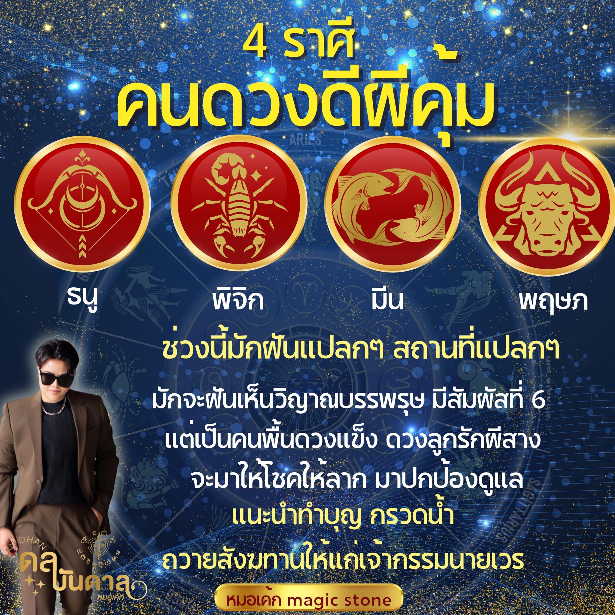 สำหรับ 4 ราศีนี้ ประกอบด้วยราศีธนู ราศีพิจิก ราศีมีน ราศีพฤษภ โดยทั้ง 4 ราศี คนดวงดีผีคุ้ม ช่วงนี้มักฝันแปลกๆ สถานที่แปลกๆ มักจะฝันเห็นวิญญาณ มีสัมผัสที่ 6
