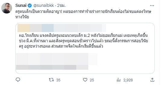 ล่าสุดด้าน"สุนัย ผาสุก" ที่ปรึกษาองค์กรสิทธิมนุษยชนนานาชาติ ฮิวแมนไรตส์วอตช์ (Human Rights Watch) ประจำประเทศไทย ได้ออกมาโพสต์ข้อความผ่านแพลตฟอร์ม X (ทวิตเตอร์) ประณามการใช้ความรุนแรง จี้เอาผิด ว่า "ครูตบเด็กเป็นความผิดทางอาญา! ไม่ว่าจะอย่างไรนี่คือการทำร้ายร่างกายเด็ก! อย่าปล่อยให้คนทำผิดกฎหมายลอยนวล!"