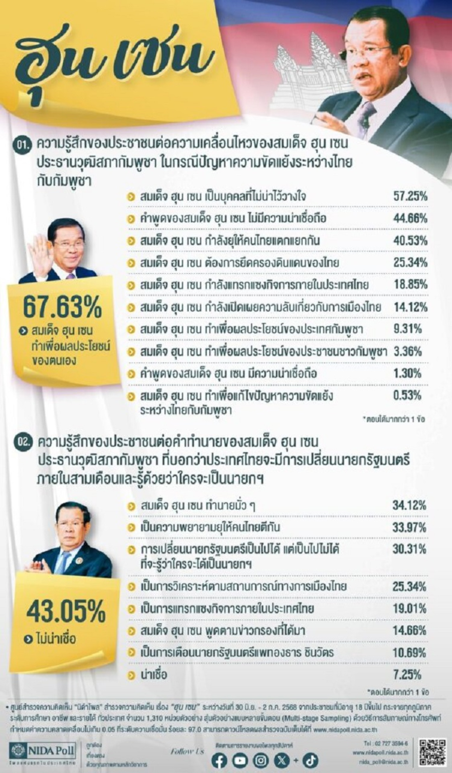 'นิด้าโพล'เผย คนไทยไม่เชื่อมั่น “ฮุน เซน” ชี้ทำเพื่อตัวเอง – ทำนายไทยเปลี่ยนนายกฯ คือการ “มั่ว”