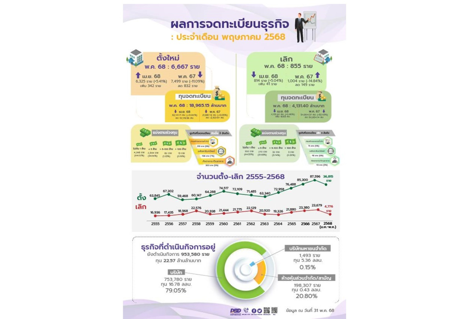 วันที่ 27 มิถุนายน 2568 นางอรมน ทรัพย์ทวีธรรม อธิบดีกรมพัฒนาธุรกิจการค้า กระทรวงพาณิชย์ เปิดเผยว่า กรมพัฒนาธุรกิจการค้าได้วิเคราะห์สถานการณ์การจดทะเบียนจัดตั้งธุรกิจใหม่เดือนพฤษภาคม 2568 พบว่า มีธุรกิจจัดตั้งใหม่ 6,667 ราย ลดลง 832 ราย (-11.09%) เมื่อเทียบกับเดือนพฤษภาคม 2567 (7,499 ราย) แต่เพิ่มขึ้น 5.4% เมื่อเทียบกับเดือนก่อนหน้า หรือเมษายน 2568 (6,325 ราย) ในขณะที่ทุนจดทะเบียนเดือนพฤษภาคม 2568 อยู่ที่ 18,965 ล้านบาท ลดลง 2,923 ล้านบาท (-13.35%) เมื่อเทียบกับเดือนพฤษภาคม 2567 (21,887 ล้านบาท) ด้านธุรกิจที่มีการจัดตั้งใหม่สูงสุด 3 อันดับแรก ได้แก่ 1) ธุรกิจก่อสร้างอาคารทั่วไป 516 ราย ทุนจดทะเบียน 886 ล้านบาท 2) ธุรกิจอสังหาริมทรัพย์ 436 ราย ทุนจดทะเบียน 1,479 ล้านบาท 3) ธุรกิจภัตตาคาร/ร้านอาหาร 300 ราย ทุนจดทะเบียน 599 ล้านบาท คิดเป็นสัดส่วน 7.74%, 6.54% และ 4.50% ของจำนวนการจัดตั้งธุรกิจในเดือนพฤษภาคม 2568 ตามลำดับ ทั้งนี้ ในเดือนพฤษภาคม 2568 มีธุรกิจที่มีทุนจดทะเบียนจัดตั้งเกิน 1,000 ล้านบาท จำนวน 1 ราย คือ บริษัทภูเก็ต อาร์บีวัน จำกัด ประกอบกิจการโรงแรม มูลค่าทุนจดทะเบียนรวมทั้งสิ้น 1,062 ล้านบาท
