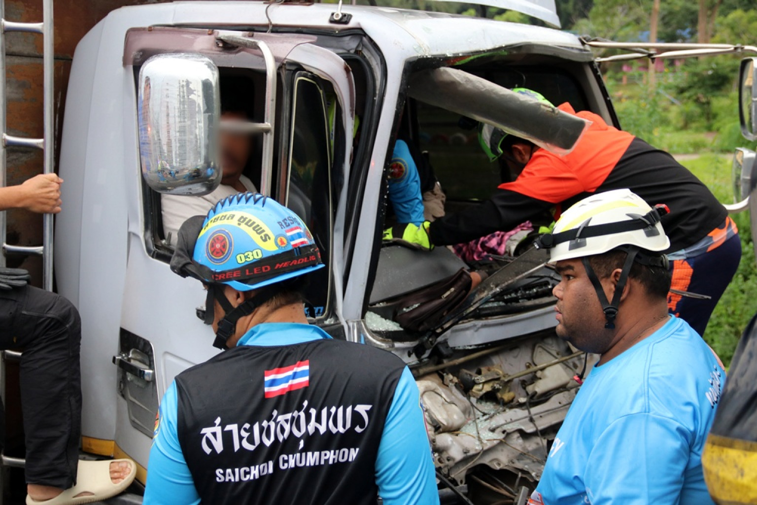 ส่วนด้านบริเวณด้านท้าย พบรถบรรทุก 6 ล้อ กระบะไม้ สีฟ้าอ่อน ยี่ห้อฮีโน่ ทะเบียนเพชรบุรี อยู่ในสภาพชนอัดติดก๊อปปี้อยู่กับส่วนตัวพ่วงของรถบรรทุก 22 ล้อ โดยมีนายสุทธิพงศ์ อายุ 38 ปี อยู่ ม.2 ต.โรงเข้ อ.บ้านลาด จ.เพชรบุรี คนขับรถโดยช่วงตั้งแต่ขาลงไปถึงเท้าอัดติดอยู่กับพวงมาลัยรถและคอลโซนอยู่ภายในเก๋ง ซึ่งยังสามารถพูดโต้ตอบกับเจ้าหน้าที่ได้เป็นอย่างดี เจ้าหน้าที่ชุดกู้ชีพกู้ภัย จึงได้นำเครื่องมืออุปกรณ์ตัดถ่าง ตัดชิ้นส่วนของตัวรถ โดยใช้เวลาเพียง 10 นาที ก็สามารถนำตัวออกมาได้โดยปลอดภัย แต่กว่าจะเคลื่อนย้ายออกจากรถมาได้ อย่างทุลักทะเล เนื่องจากนายสุทธิพงษ์ มีน้ำหนักถึง 150 กก.และต้องใช้กำลังคนช่วยหามเปลกว่า 8 คน