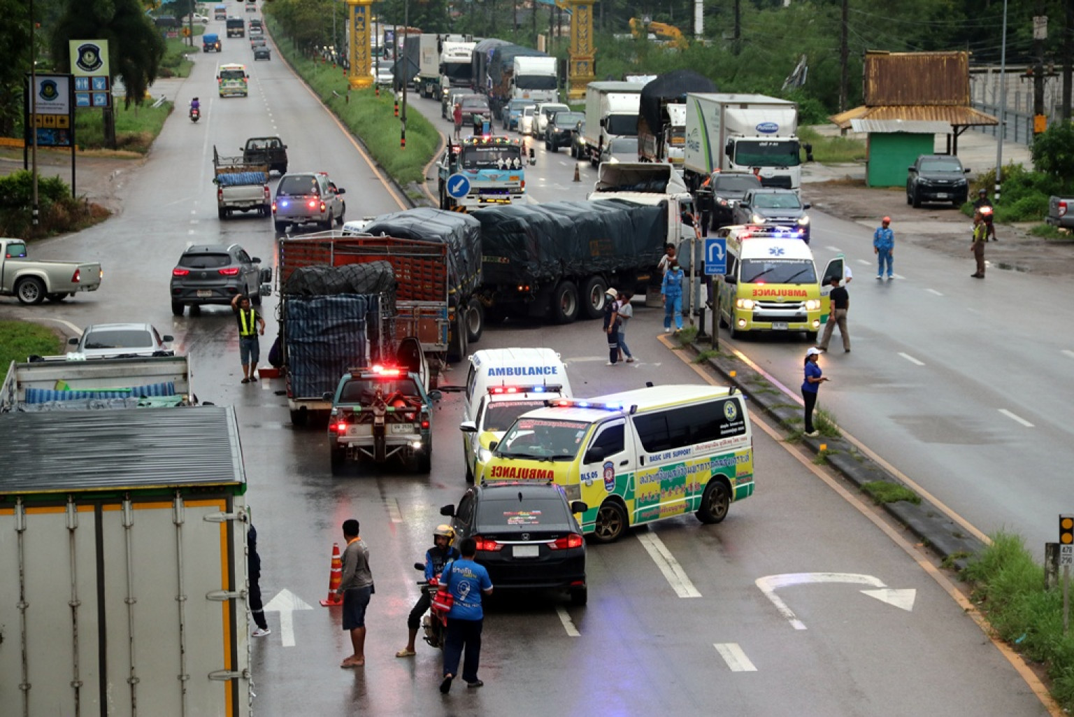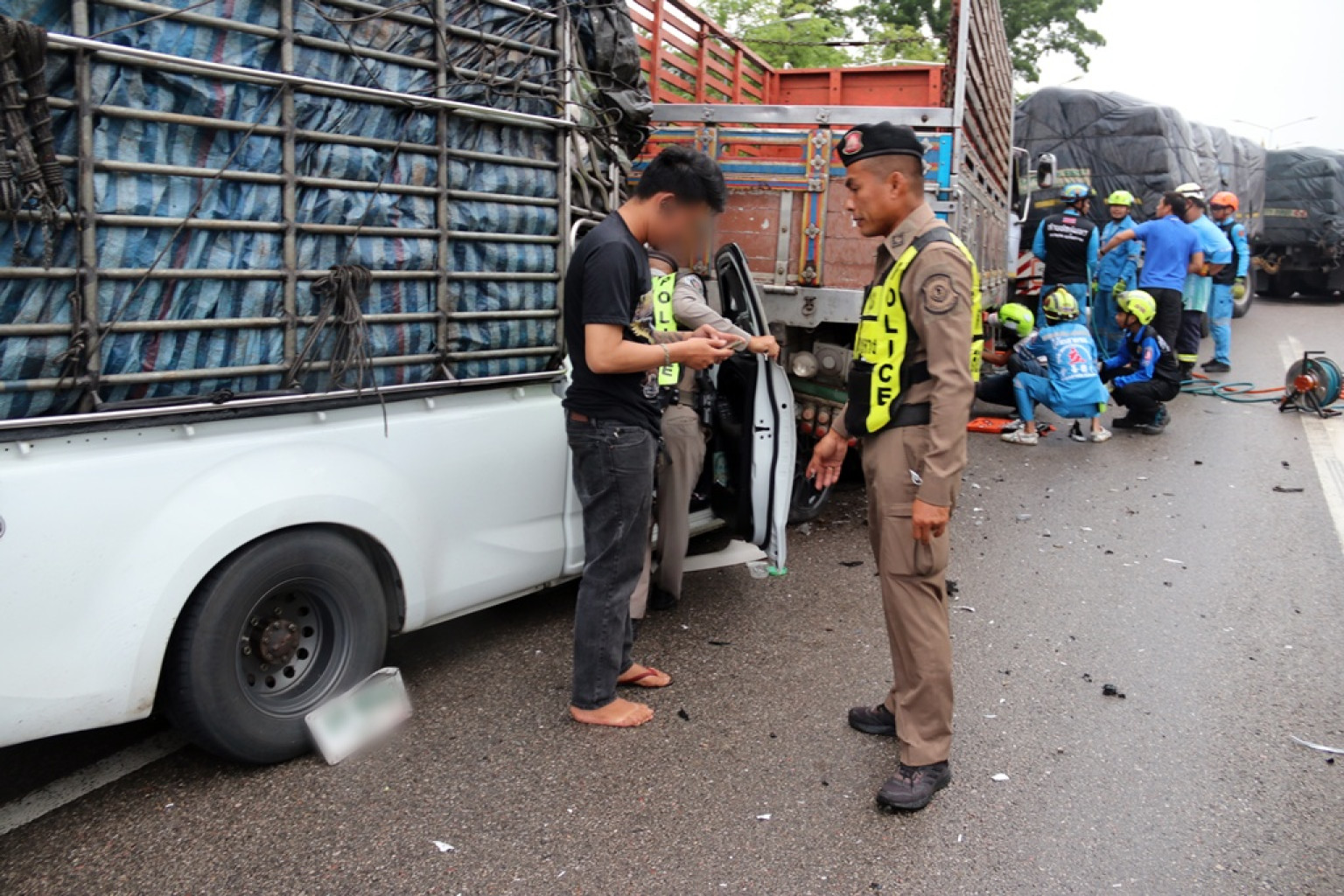 โดยในที่เกิดเหตุ พบรถบรรทุกพ่วง 22 ล้อ แบบเปลือย ยี่ห้อฮีโน่ สีขาว ทะเบียนป้ายเหลืองเพชรบุรี จอดอยู่สภาพส่วนหัวค่อมช่องจราจรลักษณะเตรียมจะเลี้ยวกลับรถ ส่วนตัวพ่วงท้าย อยู่ช่องจราจรที่สองของช่องจราจร จากสามช่องเฉพาะจุดกลับรถ โดยมีนายอันวาร อายุ 40 ปี อยู่ ม.1 ต.ตะปอเยาะ อ.ยี่งอ จ.นราธิวาส เป็นคนขับ
