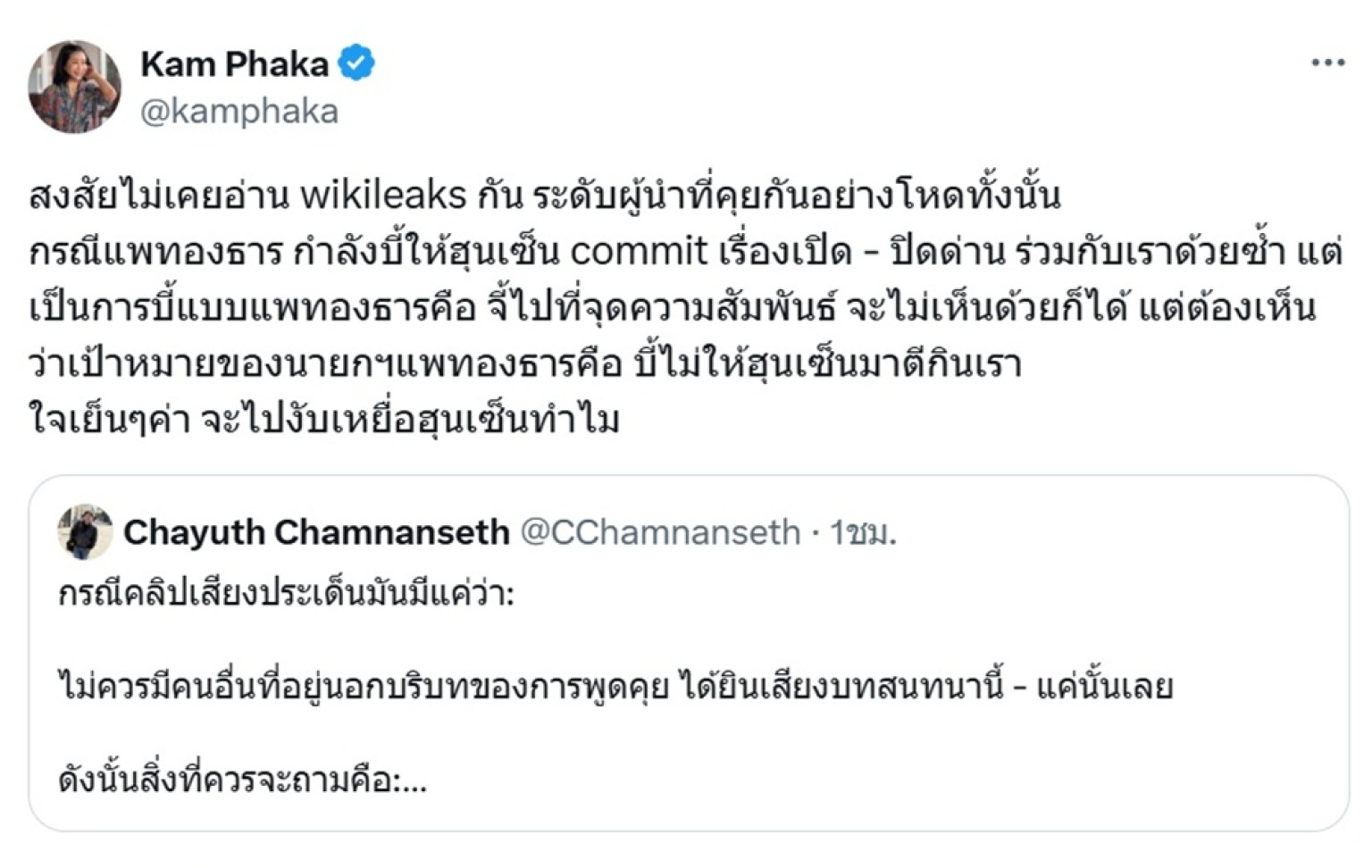 วันที่ 18 มิ.ย.68 คำ ผกา หรือ แขก พิธีกรชื่อดัง แชร์โพสต์ข้อความ นายชยุตม์ ชำนาญเศรษฐ ผ่านแอปพลิเคชั่น X (ทวิตเตอร์) @kamphaka ซึ่งระบุว่า "กรณีคลิปเสียงประเด็นมันมีแค่ว่า: ไม่ควรมีคนอื่นที่อยู่นอกบริบทของการพูดคุย ได้ยินเสียงบทสนทนานี้ - แค่นั้นเลย ดังนั้นสิ่งที่ควรจะถามคือ: ฮุนเซน เผยแพร่คลิปเสียงนี้ เพราะหวังผลอะไร? จนถึงขนาดจงใจผิดมารยาททางการทูต ไม่ใช่มาเรียกร้องให้นายกฯยุบสภา"