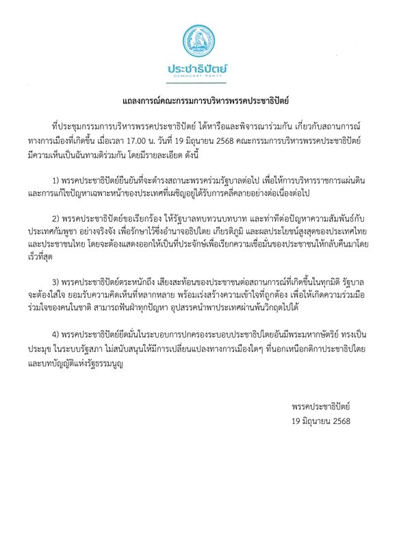 คณะกรรมการบริหารพรรคประชาธิปัตย์ได้หารือและพิจารณาร่วมกันเกี่ยวกับสถานการณ์ทางการเมืองที่เกิดขึ้น เมื่อเวลา 17.00 น. วันที่ 19 มิ.ย. 2568 มีความเห็นเป็นฉันทามติร่วมกัน โดยมีรายละเอียด ดังนี้