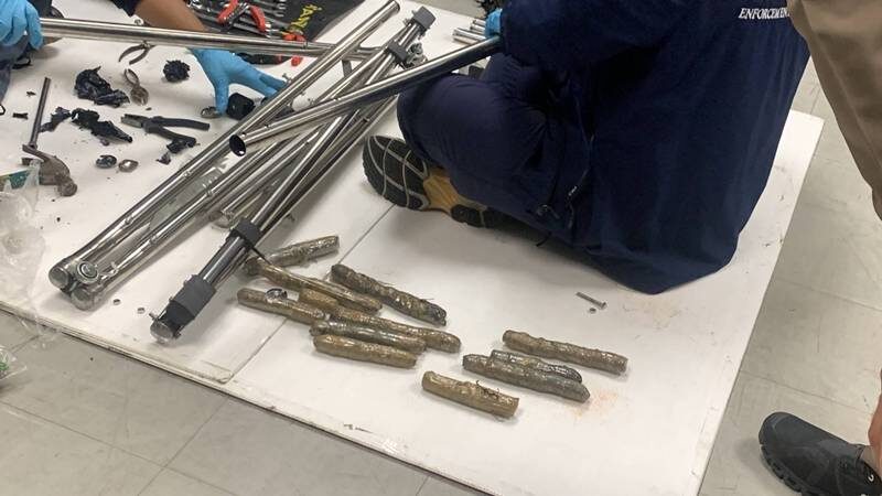 จึงได้ทำการสกัดและตรวจค้นสัมภาระ พบว่ามีลักษณะเป็นถุงผ้าใบทรงยาวสีแดง ภายในเป็นเปลสนาม พบวัสดุคล้ายไส้กรอกหุ้มด้วยพลาสติกสีน้ำตาลซุกซ่อนอยู่ในท่อเหล็กแกนของเปลสนามจำนวนทั้งสิ้น 47 ก้อน ตรวจด้วยน้ำยาพบว่าเป็นเฮโรอีนน้ำหนักรวมประมาณ 3 กก.