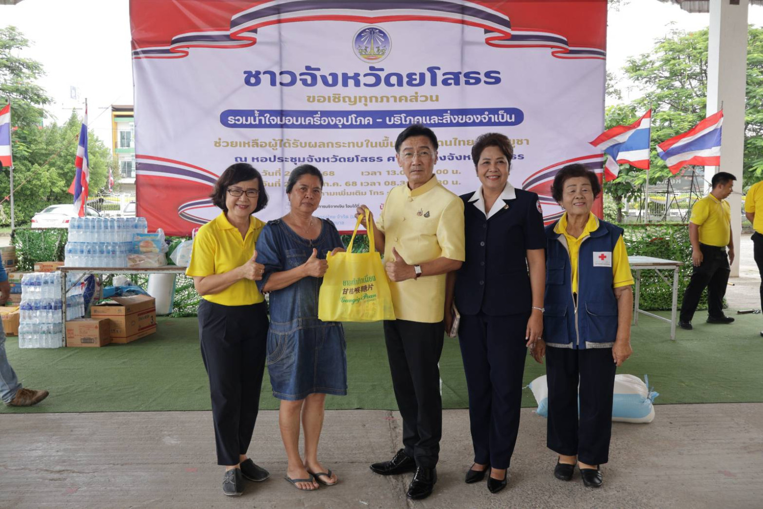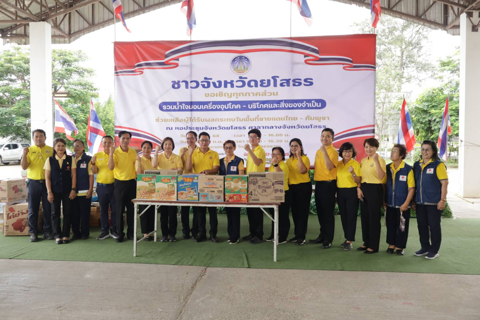 วันที่ 28 กรกฎาคม 2568 ณ หอประชุมจังหวัดยโสธร ศาลากลางจังหวัดยโสธร นายชาญชัย ศรศรีวิชัย ผู้ว่าราชการจังหวัดยโสธร พร้อมด้วย นางนันทพร ศรศรีวิชัย นายกเหล่ากาชาดจังหวัดยโสธร เป็นประธานในกิจกรรม "ชาวยโสธรรวมธารน้ำใจช่วยเหลือผู้ได้รับผลกระทบในพื้นที่ชายแดน ไทย - กัมพูชา" เพื่อเปิดรับบริจาคสิ่งของเครื่องอุปโภคบริโภคที่จำเป็นต่างๆและปัจจัยเพื่อนำไปช่วยเหลือเจ้าหน้าที่ทหารและประชาชนที่ได้รับผลกระทบจากสถานการณ์การสู้รบในพื้นที่ชายแดนไทย – กัมพูชา