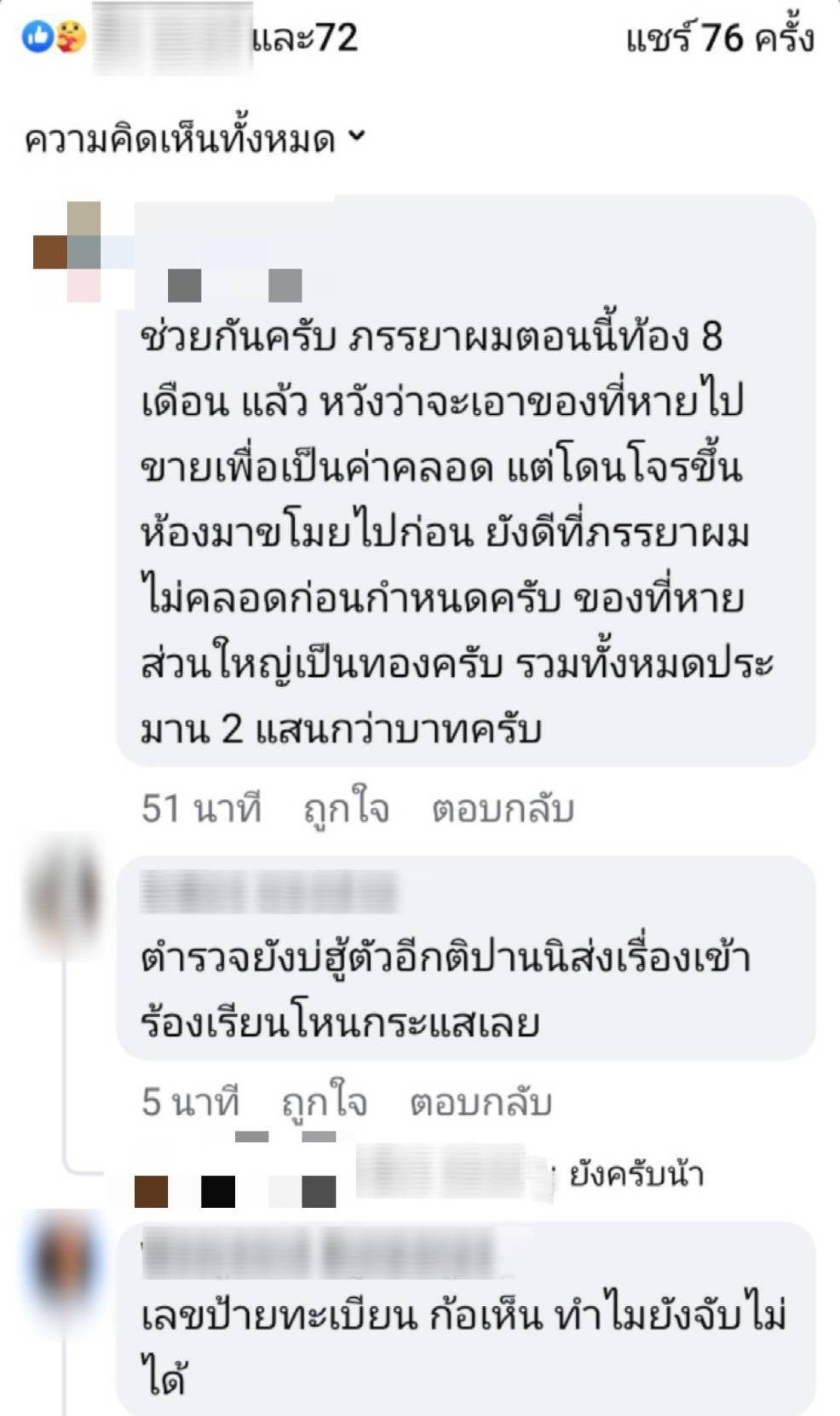 นอกจากนี้ยังมีข้อความใต้คอมเม้นเพิ่มเติมระบุว่า “ช่วยกันครับ ภรรยาผมตอนนี้ท้อง 8 เดือน แล้ว หวังว่าจะเอาของที่หายไป ขาย เพื่อเป็นค่าคลอด แต่โดนโจรขึ้นห้องมาขโมยไปก่อนกำหนดครับ ของที่หายส่วนใหญ่เป็นทองครับ รวมทั้งหมดประมาณ 2 แสนกว่าบาทครับ”