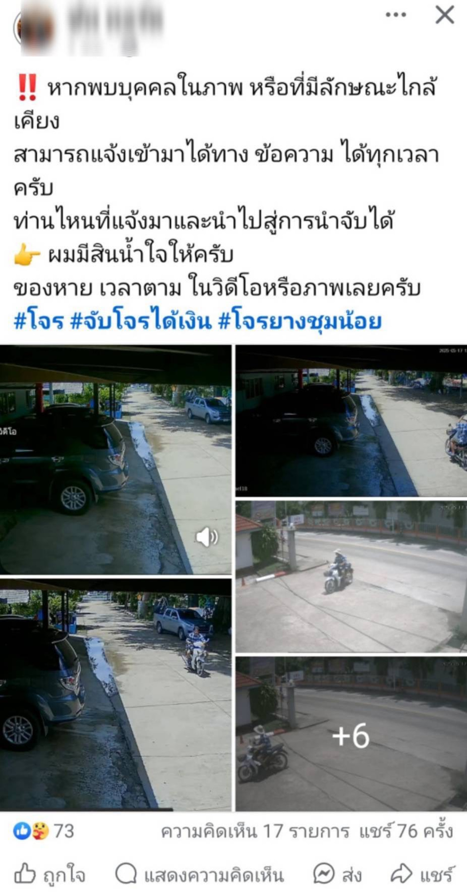 วันที่ 17 มิ.ย.68 ผู้สื่อข่าวรายงานว่า จากกรณีผู้ใช้เฟซบุ๊กรายหนึ่ง ได้โพสต์ภาพกล้องวงจรปิด พร้อมข้อความระบุว่า “หากพบบุคคลในภาพ หรือที่มีลักษณะใกล้เคียง สามารถแจ้งเข้ามาได้ทางข้อความ ได้ทุกเวลา ครับ ท่านไหนที่แจ้งมาและนำไปสู่การนำจับได้ ผมมีสินน้ำใจให้ครับ ของหาย เวลาตามในวีดีโอหรือภาพเลยครับ #โจร #จับโจรได้เงิน #โจรยางชุมน้อย ”