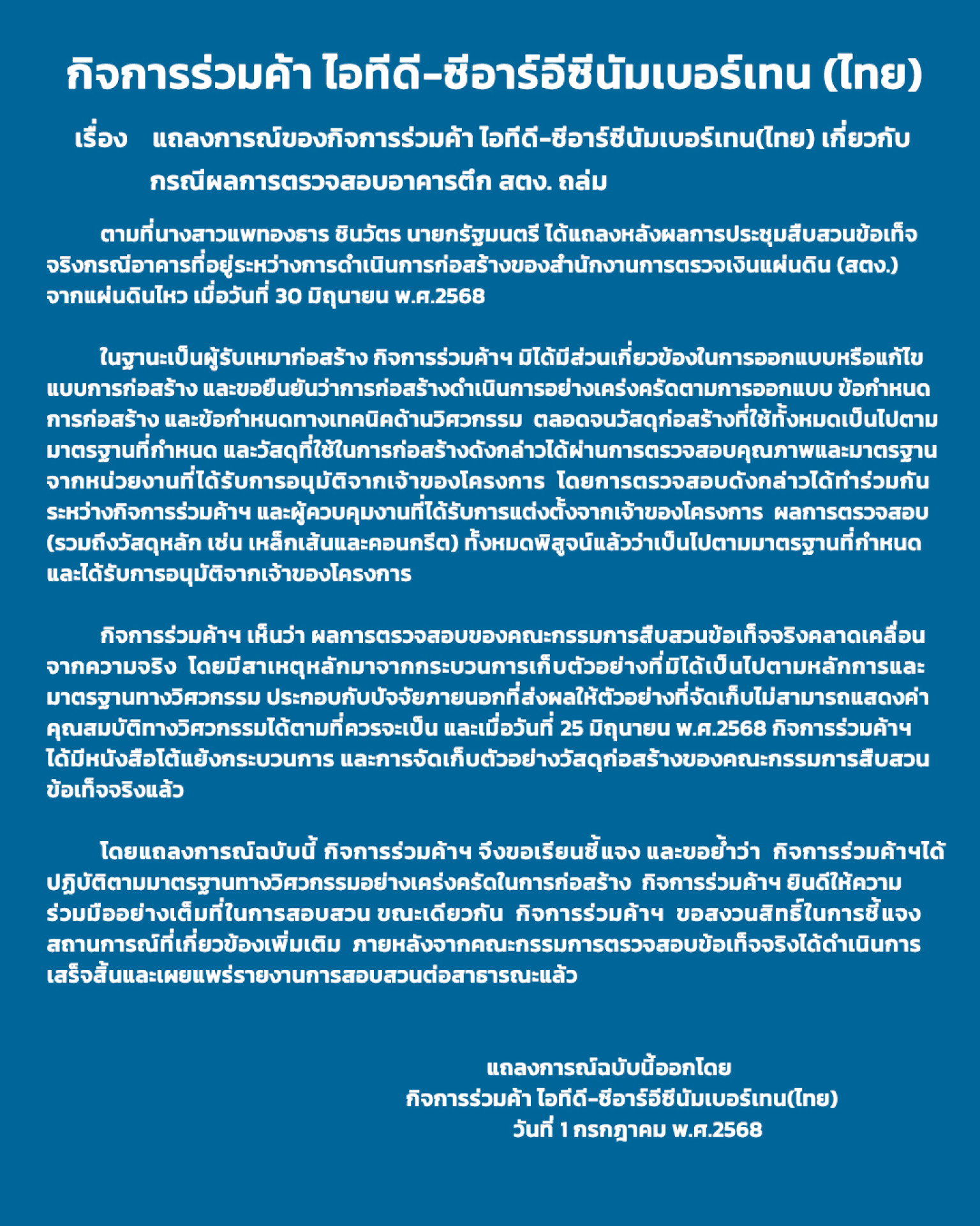 เมื่อวันที่ 1 ก.ค. 68 กิจการร่วมค้า ไอทีดี-ซีอาร์อีซี ในฐานะเป็นผู้รับเหมาก่อสร้าง ออกแถลงการณ์เกี่ยวกับกรณีดังกล่าว ว่า กิจการร่วมค้าฯ มิได้มีส่วนเกี่ยวข้องในการออกแบบหรือแก้ไขแบบการก่อสร้าง และขอยืนยันว่าการก่อสร้างดำเนินการอย่างเคร่งครัดตามการออกแบบ ข้อกำหนดการก่อสร้าง และข้อกำหนดทางเทคนิคด้านวิศวกรรม ตลอดจนวัสดุก่อสร้างที่ใช้ทั้งหมดเป็นไปตามมาตรฐานที่กำหนด และวัสดุที่ใช้ในการก่อสร้างดังกล่าวได้ผ่านการตรวจสอบคุณภาพและมาตรฐานจากหน่วยงานที่ได้รับการอนุมัติจากเจ้าของโครงการ