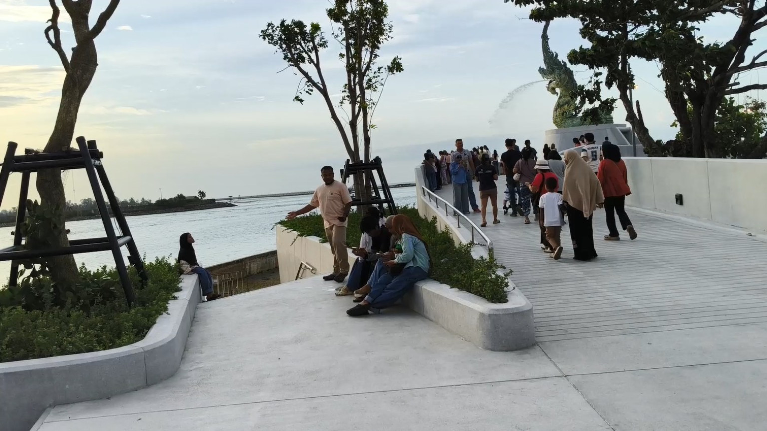 สงขลา นักท่องเที่ยวแห่เที่ยวประติมากรรมพญานาคพ่นน้ำ “องค์นาคาธิบดี” ถ่ายภาพพระอาทิตย์ตก