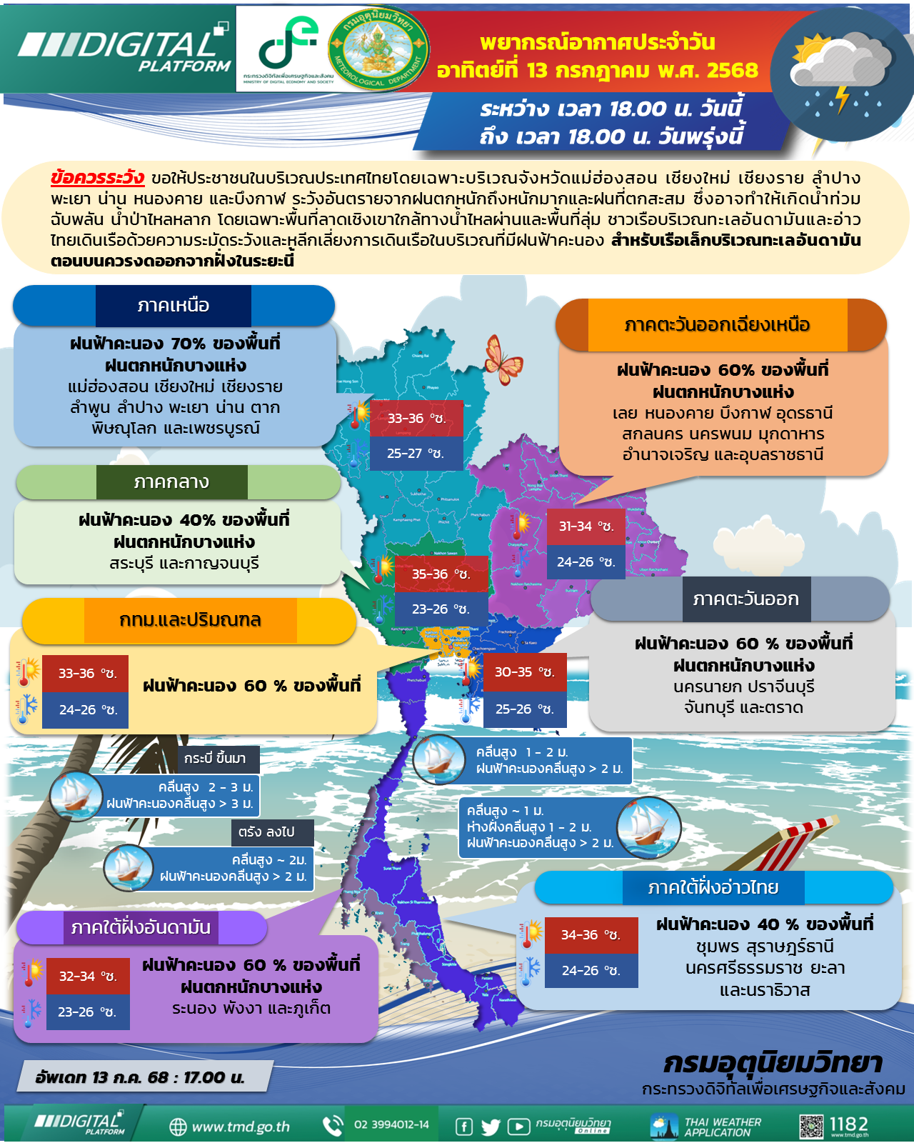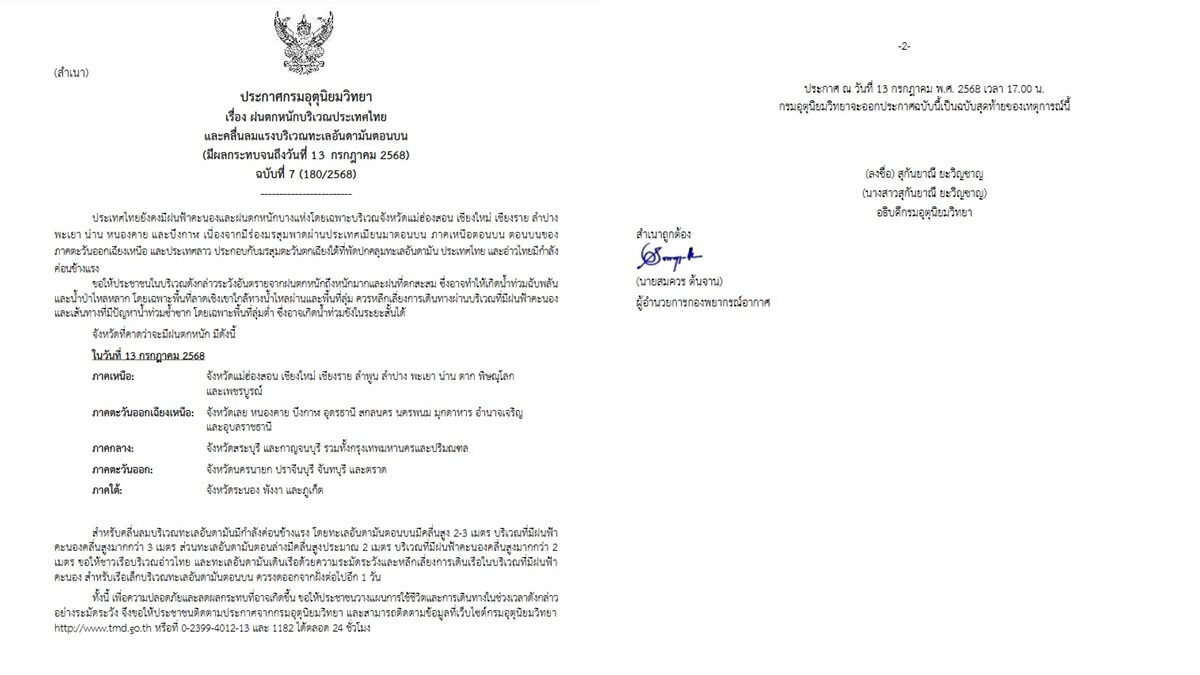 เวลา 17.00 น. กรมอุตุนิยมวิทยา ประกาศกรมอุตุนิยมวิทยา เรื่อง ฝนตกหนักบริเวณประเทศไทย และคลื่นลมแรงบริเวณทะเลอันดามันตอนบน (มีผลกระทบจนถึงวันที่ 13 กรกฎาคม 2568) ฉบับที่ 7 (180/2568)