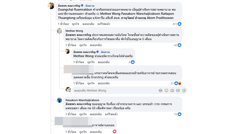 ต่อมา พล.อ.อ.นพ.อิทธพร คณะเจริญ เลขาธิการแพทยสภา เข้ามาคอมเมนต์ที่โพสต์ของคลินิก ระบุว่า ฝ่ายจริยธรรมช่วยออกจดหมาย เชิญผู้ดำเนินการสถานพยาบาล พบเลขาธิการแพทยสภา ด้วยครับ เตรียมข้อมูล แจ้งหารือ อธิบดี สบส. ภานุวัฒน์ ปานเกตุ