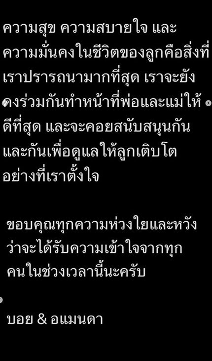 “จะขอพูดที่รายการนี้รายการเดียวรายการสุดท้าย ก็ตามที่โพสต์เลย อแมนด้า เขากลับไปเยี่ยมยายเขาทุกปี พาลูกไปด้วย สิงหาคม ก็กลับมาแล้ว เพราะ 8 สิงหา โรงเรียนลูกจะเปิด เขาก็อยู่ที่นี่ ช่วยกันดูแลลูกให้อบอุ่นมากที่สุด สถานะพ่อแม่ไม่มีลาออกได้ ”