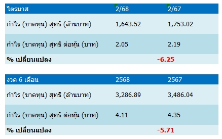 โดยกำไรสุทธิงวดไตรมาส 2 ปี 68 ลดลงจากช่วงเดียวกันของปีก่อน เนื่องจากรายได้รวมที่อ่อนตัวลง รายได้ดอกเบี้ยสุทธิลดลง ร้อยละ 1.7 ผลจากการปรับลดอัตราดอกเบี้ยนโยบายของธนาคารแห่งประเทศไทย และการลดภาระดอกเบี้ยให้แก่ลูกหนี้กลุ่ม เปราะบางในโครงการ “คุณสู้ เราช่วย” ขณะที่ต้นทุนทางการเงินปรับลดลงอย่างค่อยเป็นค่อยไป