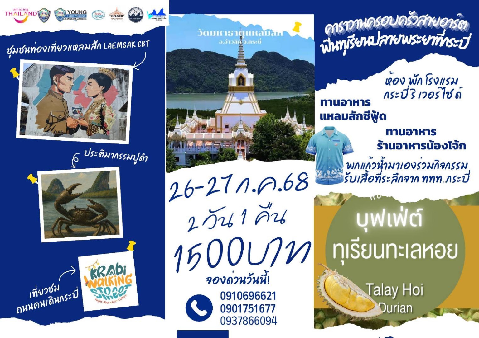 คอทุเรียน..ต้องห้าม! “โกหยู” เอกพงศ์ โชคชัยวิทัศน์ ประธานหอการค้าจังหวัดกระบี่ ผนึกกำลัง การท่องเที่ยวแห่งประเทศไทย (ททท.) จัดงาน “กินทุเรียนพื้นบ้าน” ให้ทุกคนได้ลิ้มลองอร่อยสะใจกับทุเรียนหลากหลายสายพันธุ์ ระหว่างวันที่ 26-27 กรกฎาคมนี้ ณ บ้านทะเลหอย อำเภอปลายพระยา จังหวัดกระบี่ พร้อมกับกิจกรรมท่องเที่ยวชุมชนแหลมสัก และถ่ายรูปลานประติมากรรมปูดำ หวังดึงนักท่องเที่ยวชาวไทยและต่างชาติ ตะลุยกระบี่กลางฤดูฝน! กระตุ้นเศรษฐกิจท่องเที่ยวช่วงโลว์ซีซัน ก่อนถึงไฮซีซันปลายปี พร้อมผลักดันเศรษฐกิจฐานราก กระตุ้นกำลังซื้อในท้องถิ่น หนุนผู้ประกอบการรายย่อย ต่อยอดสินค้าชุมชน เสริมสร้างความแข็งแกร่งให้กับจังหวัดอีกด้วย เอาเป็นว่า ใครสายกิน สายเที่ยว ห้ามพลาด! แล้วจะรู้ว่า…กระบี่ไม่ได้มีดีแค่ทะเล!