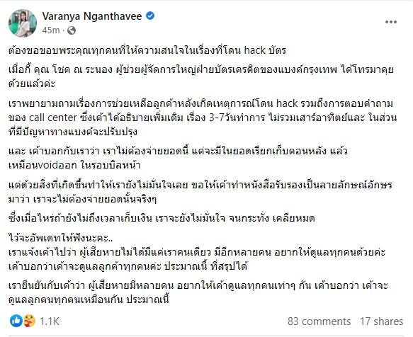 ล่าสุด วันที่ 13 ก.พ. 66 คุณหมอลิลลี่ โพสต์แจ้งความคืบหน้าว่า ต้องขอขอบพระคุณทุกคนที่ให้ความสนใจในเรื่องที่โดน hack บัตร เมื่อกี้ คุณ โชค ณ ระนอง ผู้ช่วยผู้จัดการใหญ่ฝ่ายบัตรเครดิตของแบงก์กรุงเทพ ได้โทรมาคุยด้วยแล้วค่ะ เราพยายามถามเรื่องการช่วยเหลือลูกค้าหลังเกิดเหตุการณ์โดน hack รวมถึงการตอบคำถามของ call center ซึ่งเค้าได้อธิบายเพิ่มเติม เรื่อง 3-7 วันทำการ ไม่รวมเสาร์อาทิตย์และ ในส่วนที่มีปัญหาทางแบงก์จะปรับปรุง เค้าบอกกับเราว่า เราไม่ต้องจ่ายยอดนี้ แต่จะมีในยอดเรียกเก็บตอนหลัง แล้วเหมือนvoidออก ในรอบบิลหน้า