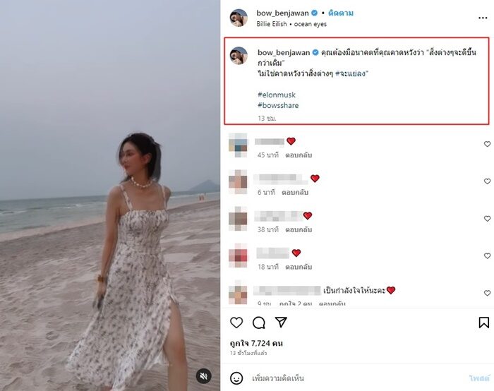 แถมสาวโบว์ ยังลงคลิปของตัวเองพร้อมแคปชั่น "คุณต้องมีอนาคตที่คุณคาดหวังว่า "สิ่งต่าง ๆ จะดีขึ้นกว่าเดิม" ไม่ใช่คาดหวังว่าสิ่งต่าง ๆ #จะแย่ลง #elonmusk #bowsshare" และลงไอจีสตอรี่เรื่อง "เสียของ" ระบุว่า "อะไรคือ "เสียของ"? มีสมองแต่ไม่ใช้คิด มีสองมือแต่ไม่ทำงาน มีปากแต่ไม่ใช้พูดเรื่องดี มีหัวใจแต่ไม่ใส่ความดีเข้าไป มีชีวิตปล่อยไปตามยถากรรม" นอกจากนั้นยังโพสต์คำคมเป็นภาษาอังกฤษว่าLife is simple, but we insist to make it complicated. #ICanDoit #เชื่อสิฉันทำได้ #bowsshare ทำเอาสงสัยว่าสื่อความหมายถึงความรู้สึกช่วงนี้ไหม หรืออาจเป็นแค่การแชร์ข้อคิดคำคมตามปกติของเจ้าตัวเท่านั้น