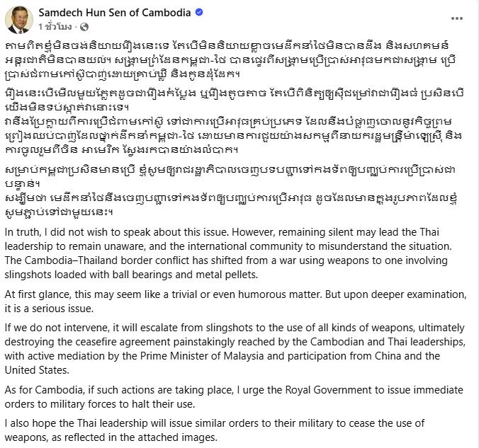เมื่อเวลา วันที่ 8 ส.ค. 2568 สมเด็จ ฮุน เซน ประธานวุฒิสภากัมพูชา ได้โพสต์เฟซบุ๊กอ้างว่า ทหารไทยใช้หนังสติ๊กที่บรรจุลูกปืนและเม็ดโลหะยิงใส่ทหารกัมพูชา ขอให้รัฐบาลไทยสั่งให้หยุดใช้ทันที