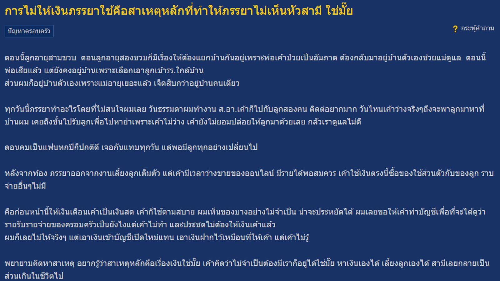 สามีโพสต์ระบาย แต่ก่อนให้เงินภรรยาใช้ พอไม่ให้ เธอก็ไม่เห็นหัว ทำเหมือนสามีเป็นส่วนเกิน-เลี้ยงลูกคนเดียว ถาม "เงิน" คือสาเหตุหลักใช่ใหม?