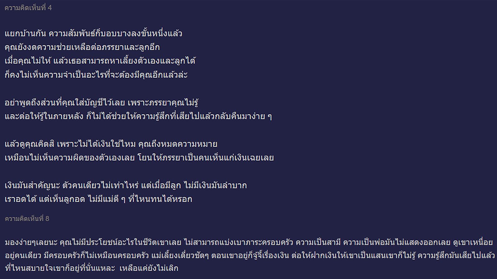 ด้านความคิดเห็นของชาวเน็ต ส่วนใหญ่เห็นใจ "ภรรยาเจ้าของกระทู้" โดยมองว่าแค่แยกกันอยู่ก็เหมือนความสัมพันธ์บอบบางลงหนึ่งขั้นแล้ว แต่นี่ภรรยาต้องเลี้ยงลูกคนเดียว แถมเจ้าของกระทู้ยังงดให้ความช่วยเหลือภรรยาและลูกอีก