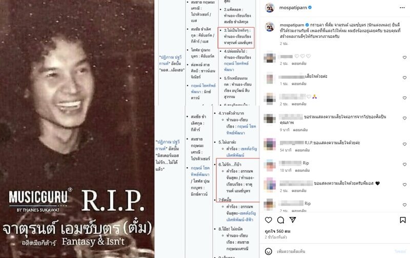 วันที่ 26 เมษายน 67 นักร้องดัง มอส ปฏิภาณ โพสต์ภาพนักแต่งเพลงชื่อดัง และอดีตมือกีต้าร์ ตั๋ม จาตุรนต์ เอมซ์บุตร พร้อมข้อความสุดอาลัยว่า