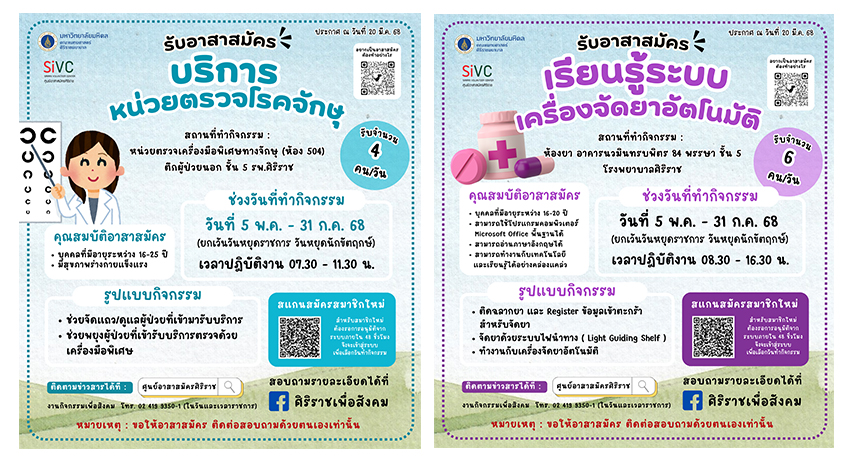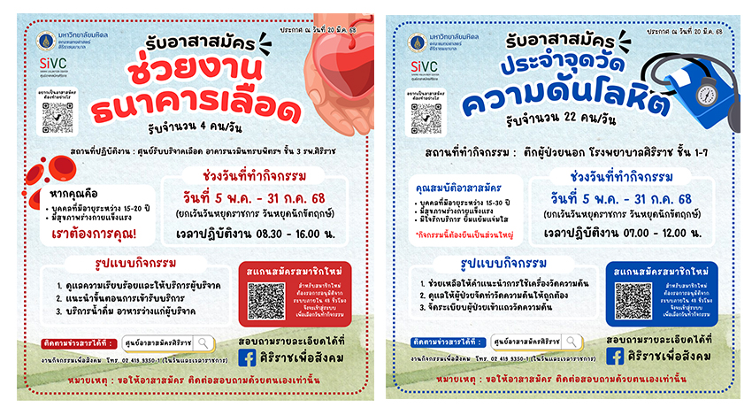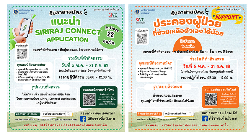 เปิดรับอาสาสมัครศิริราช รอบทำกิจกรรม เดือน พ.ค.-ก.ค. 68 ทุกกิจกรรมมีใบรับรองการทำกิจกรรม