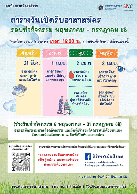 ตารางการรับอาสาสมัครรอบทำกิจกรรม เดือน พฤษภาคม – กรกฏาคม 68 (กิจกรรมที่อยู่ในเว็บไซต์ตอนนี้เป็นรอบเก่ามีผู้เข้าร่วมเต็มทั้งหมดแล้วค่ะ รอบใหม่จะเปิดตามวันเวลาที่แจ้งด้านล่างนี้เท่านั้น*) ขอให้อาสาเป็นผู้สมัครและกดเลือกกิจกรรมด้วยตนเองนะคะ - 31 ก.ค. 68 **เนื่องจากวันที่ 5 พ.ค. เป็นวันหยุด จะขอเริ่มตั้งแต่วันที่วันที่ 6 พ.ค. เป็นต้นไปนะคะ (ยกเว้นวันหยุดราชการ และวันหยุดนักขัตฤกษ์) การเปิดระบบ ทุกกิจกรรมจะขึ้นให้กดในเว็บไซต์ คลิก (หน้าแรก เวลา 16.00 น. เป็นต้นไป ตรงกิจกรรมที่กำลังจะเกิดขึ้น) หากเต็มระบบจะขึ้นว่าเต็มและไม่สามารถกดเข้าร่วมได้ *ระบบจะเปิดในวันตามตารางที่แจ้งไว้เท่านั้น ตอนนี้จะยังไม่มีกิจกรรมขึ้นค่ะ/ครับ วันที่เปิดระบบ - 31 มีนาคม 68 เปิดระบบรับอาสาสมัครประจำจุดวัดความดันโลหิต - 1 เมษายน 68 เปิดระบบรับอาสาสมัครแนะนำ Siriraj Connect Application - 2 เมษายน 68 เปิดระบบรับอาสาสมัครช่วยงานธนาคารเลือด + อาสาสมัครประคองผู้ป่วยที่ช่วยเหลือตัวเองได้น้อย - 3 เมษายน 68 เปิดระบบรับอาสาสมัครบริการหน่วยตรวจโรคจักษุ + อาสาสมัครเรียนรู้ระบบเครื่องจัดยาอัตโนมัติ รายละเอียดของแต่ละกิจกรรม :https://www.facebook.com/share/p/18VUyosCov/ *น้องอาสาสมัครอย่าลืมสมัครสมาชิกไว้ก่อน (สำหรับผู้ที่ยังไม่เคยสมัคร) และในวันที่เปิดระบบ อย่าลืม!! ล็อคอินเข้าสู่ระบบเพื่อรอเวลาเปิดกิจกรรมและเลือกวันทำกิจกรรมด้วยตนเอง*** . อาสาสมัครสามารถเลือกวันทำกิจกรรมได้ด้วยตนเองค่ะ กี่วันก็ได้ แต่ขอให้เป็นวันสามารถที่มาปฏิบัติงานได้จริง และขอให้ตรวจสอบวันที่ตัวเองเลือกทุกครั้ง หากพบว่าไม่สามารถมาทำกิจกรรมได้ในวันไหน รบกวนแจ้งทางศูนย์อาสาสมัครล่วงหน้าอย่างน้อย 1-2 สัปดาห์ค่ะ . .***ทุกกิจกรรมมีใบรับรองการทำกิจกรรมจิตอาสา (ระบุชั่วโมงจิตอาสาตามชั่วโมงที่มาปฏิบัติงานจริง) 1 วันก็ได้รับใบรับรองค่ะ/ครับ ขอให้อาสากดเข้าร่วมเฉพาะวันที่สามารถมาทำกิจกรรมได้เท่านั้น ไม่กดเผื่อเลือก ทางศูนย์ฯ จะมีระบบ Blacklist หากอาสาสมัครไม่สามารถมาร่วมกิจกรรมในวันที่ได้กดเข้าร่วมไว้ได้โดยไม่มีการแจ้งยกเลิกล่วงหน้า ทุกกิจกรรมมีใบรับรองให้ตามชั่วโมงที่ปฏิบัติงานจริงของแต่ละกิจกรรม* สอบถามข้อมูลเพิ่มเติม : งานกิจกรรมเพื่อสังคม โทร. 02 419 9350 -1 / 02 419 9065 หรือ ช่องแชทผ่าน facebook "ศิริราชเพื่อสังคม" (ในวันและเวลาราชการเท่านั้น)