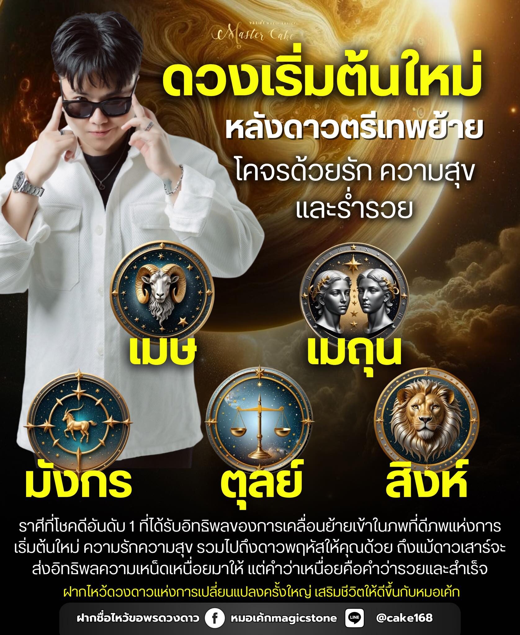 หมอเค้กMagic stone เผยถึงดวงเริ่มต้นใหม่ หลังดาวตรีเทพย้าย โคจรด้วยรัก ความสุขและร่ำรวย ราศีที่โชคดีอันดับ 1 ที่ได้รับอิทธิพลของการเคลื่อนย้ายเข้าในภพที่ดีแห่งการเริ่มต้นใหม่ ความรักความสุข รวมไปถึงดาวพฤหัสให้คุณด้วย ถึงแม้ดาวเสาร์จะส่งอิทธิพลความเหน็ดเหนื่อยมาให้ แต่คำว่าเหนื่อยคือ คำว่ารวยและสำเร็จ