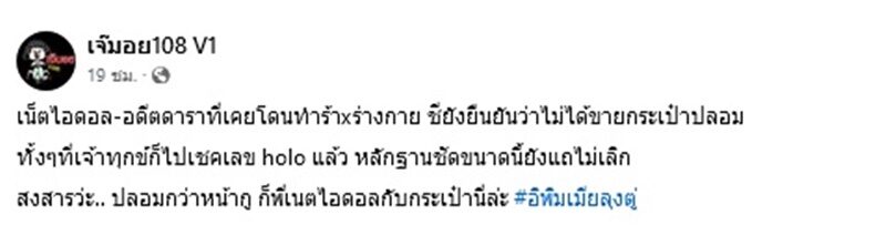 “เน็ตไอดอล-อดีตดาราที่เคยโดนทำร้ายร่างกาย ชียังยืนยันว่าไม่ได้ขายกระเป๋าปลอม ทั้งๆที่เจ้าทุกข์ก็ไปเช็คเลข holo แล้ว หลักฐานชัดขนาดนี้ยังแถไม่เลิก สงสารว่ะ.. ปลอมกว่าหน้ากู ก็พี่เน็ตไอดอลกับกระเป๋านี่ล่ะ #อิพิมเมียลุงตู่”