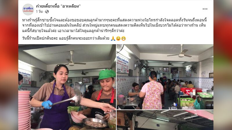 ขณะที่ก๋วยเตี๋ยวเนื้อ "อาเหลียง" ได้โพสต์ชี้แจงถึงเรื่องดังกล่าวว่า ทางร้านรู้สึกซาบซึ้งใจและต้องขอขอบคุณลูกค้ามากๆนะคะที่แสดงความห่วงใยโทรให้กำลังใจตลอดทั้งวันจนถึงตอนนี้ จากที่ลองเข้าไปอ่านคอมเมนต์ในคลิป ส่วนใหญ่แทบทุกคนแสดงความคิดเห็นไปในเชิงบวกไม่ได้ต่อว่าทางร้าน เห็นแค่นี้ก็สบายใจแล้วค่ะ เอาเวลามาใส่ใจดูแลลูกค้าน่ารักๆดีกว่าค่ะ วันนี้ร้านเปิดปกตินะคะ แอบรู้สึกคนจะเยอะกว่าเดิมด้วย
