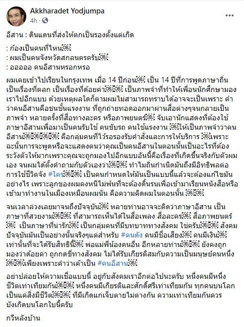 ใช่ครับ สังคมปัจจุบันมันเป็นอย่างนั้นจริงๆแต่สำหรับ #คนดัง คนมีชื่อเสียง คนมีเงิน เท่านั้นที่จะได้รับสิทธินี้ พ่อแม่พี่น้องคนอื่น อีกหลายท่าน ยังคงถูกมองว่าด้อยค่า ถูกกดขี่ทางสังคม ไม่ได้รับเกียรติสมกับความเป็นมนุษย์คนหนึ่ง เพียงเพราะคำว่าเค้าเป็น #คนอีสาน