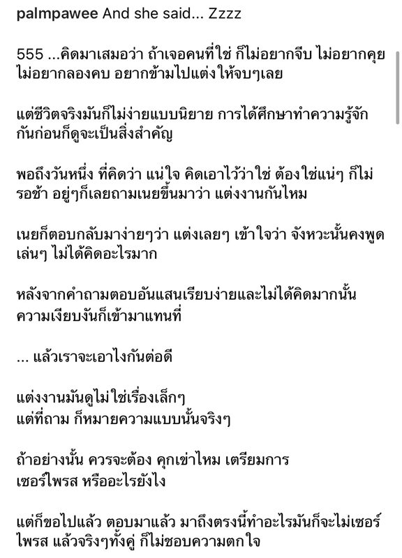 “แต่งงานมันดูไม่ใช่เรื่องเล็กๆ แต่ที่ถาม ก็หมายความแบบนั้นจริงๆ ถ้าอย่างนั้น ควรจะต้อง คุกเข่าไหม เตรียมการ เซอร์ไพรส์ หรืออะไรยังไง แต่ก็ขอไปแล้ว ตอบมาแล้ว มาถึงตรงนี้ทำอะไรมันก็จะไม่เซอร์ไพรส์ แล้วจริงๆ ทั้งคู่ ก็ไม่ชอบความตกใจ”