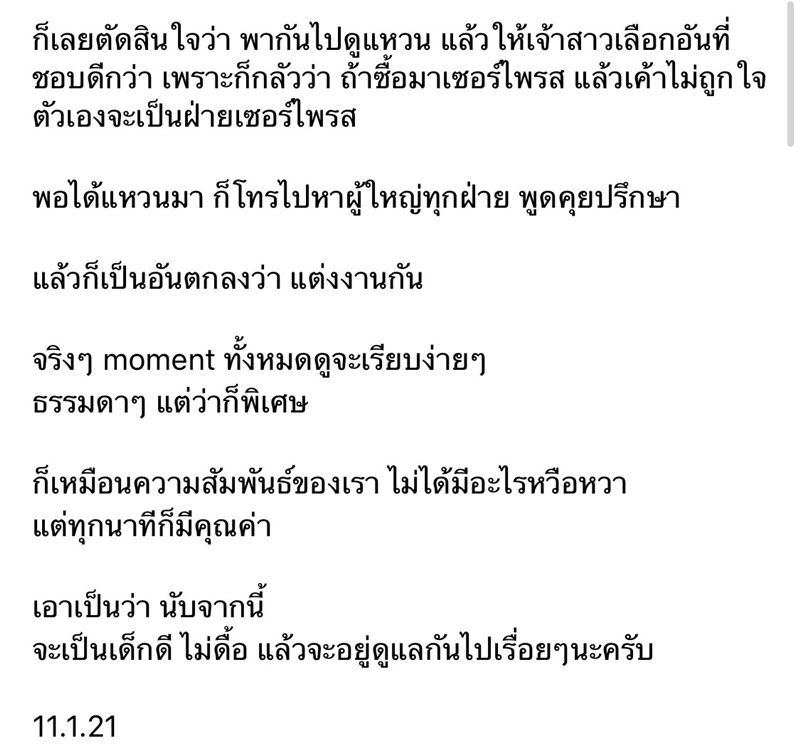 “จริงๆ moment ทั้งหมดดูจะเรียบง่ายๆ ธรรมดาๆ แต่ว่าก็พิเศษ ก็เหมือนความสัมพันธ์ของเรา ไม่ได้มีอะไรหวือหวา แต่ทุกนาทีก็มีคุณค่า เอาเป็นว่า นับจากนี้ จะเป็นเด็กดี ไม่ดื้อ แล้วจะอยู่ดูแลกันไปเรื่อยๆ นะครับ 11.1.21”