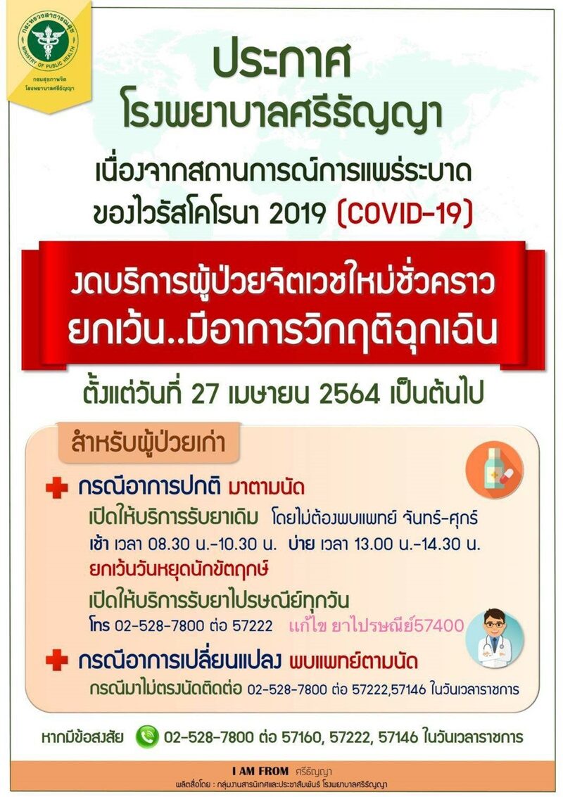 วันที่ 26 เม.ย. 2564 ที่โรงพยาบาลศรีธัญญา ถนนติวานนท์ ต.ตลาดขวัญ อ.เมืองนนทบุรี จ.นนทบุรี ผู้สื่อข่าวรายงาน เจ้าหน้าที่รพ.ได้ติดป้ายประกาศของโรงพยาบาลศรีธัญญา ระบุว่า เนื่องจากสถานการณ์การแพร่ระบาดของไวรัสโคโรน่า 2019 ( COVID-19 ) งดบริการผู้ป่วยจิตเวชใหม่ชั่วคราว ยกเว้น..มีอาการวิกฤติฉุกเฉิน ตั้งแต่ 27 เมษายน 2564 เป็นต้นไป